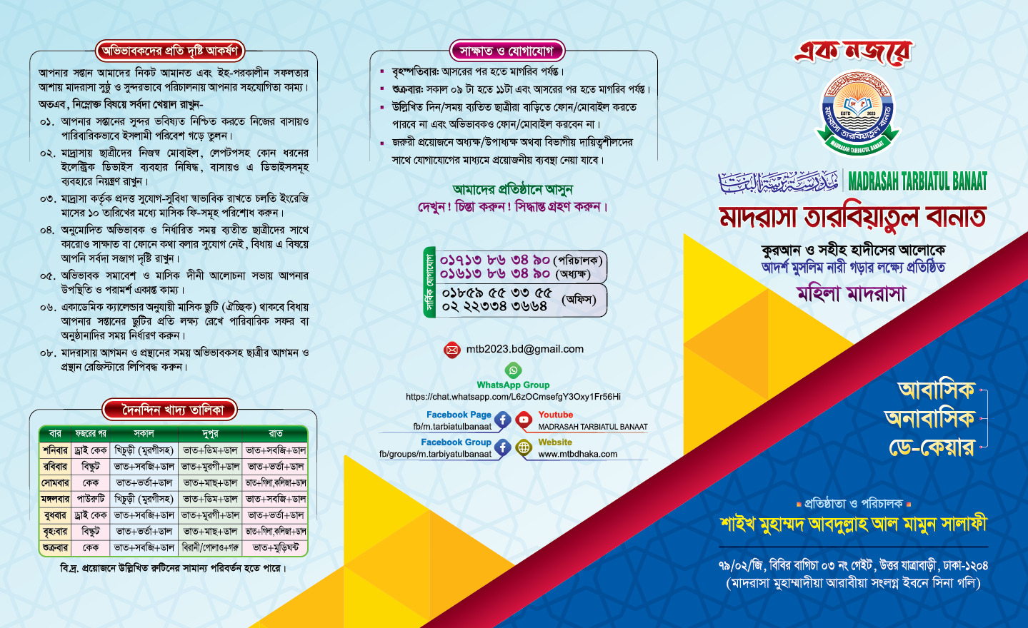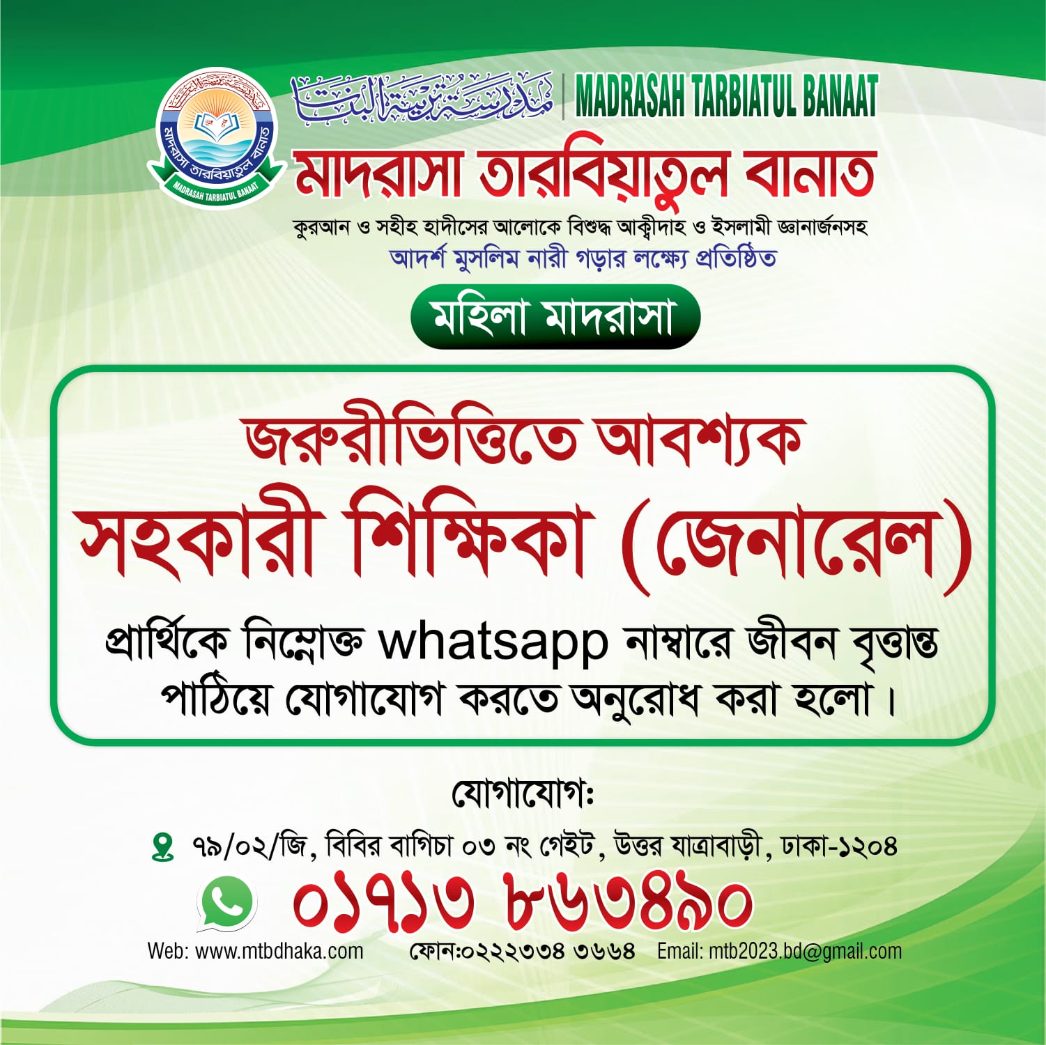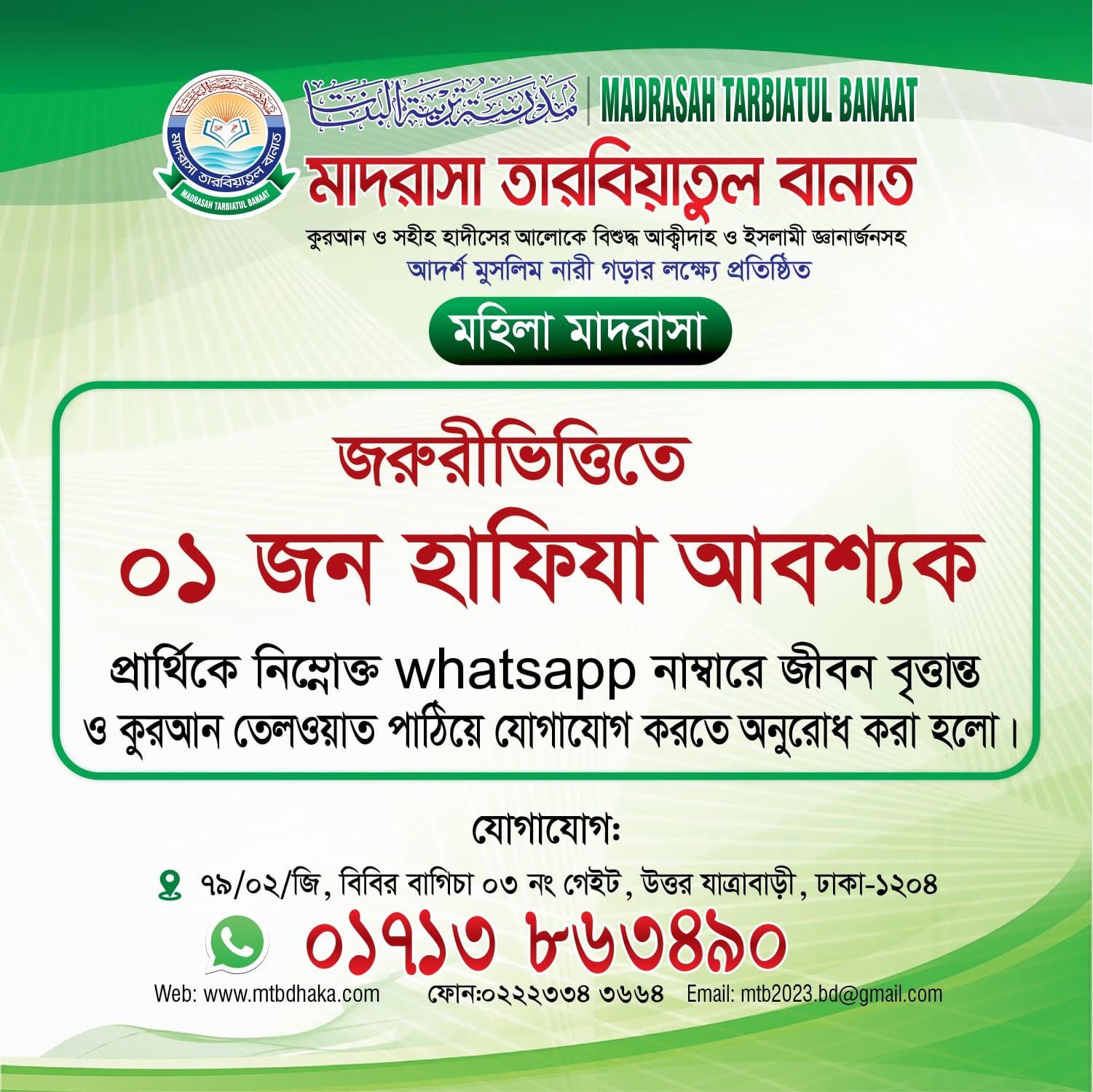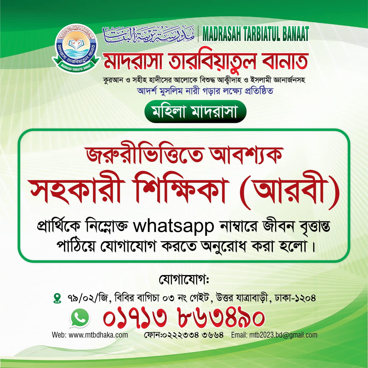 মাদরাসা তারবিয়াতুল উম্মাহ এর পক্ষ থেকে জানাই স্বাগতম ও শুভেচ্ছা। পৃথিবীর সাথে তাল মিলিয়ে দেশ যখন এগিয়ে যাচ্ছে আমরা কেন তাহলে অন্যদের চেয়ে পিছিয়ে থাকবো ? আমরা সৃজনশীল শিক্ষা দানের উদ্দেশ্যে যুগোপযোগী ও আধুনিক মাদরাসা প্রতিষ্ঠার লক্ষ্যে একটি যুগান্তকারী উদ্যোগ গ্রহণ করেছি।